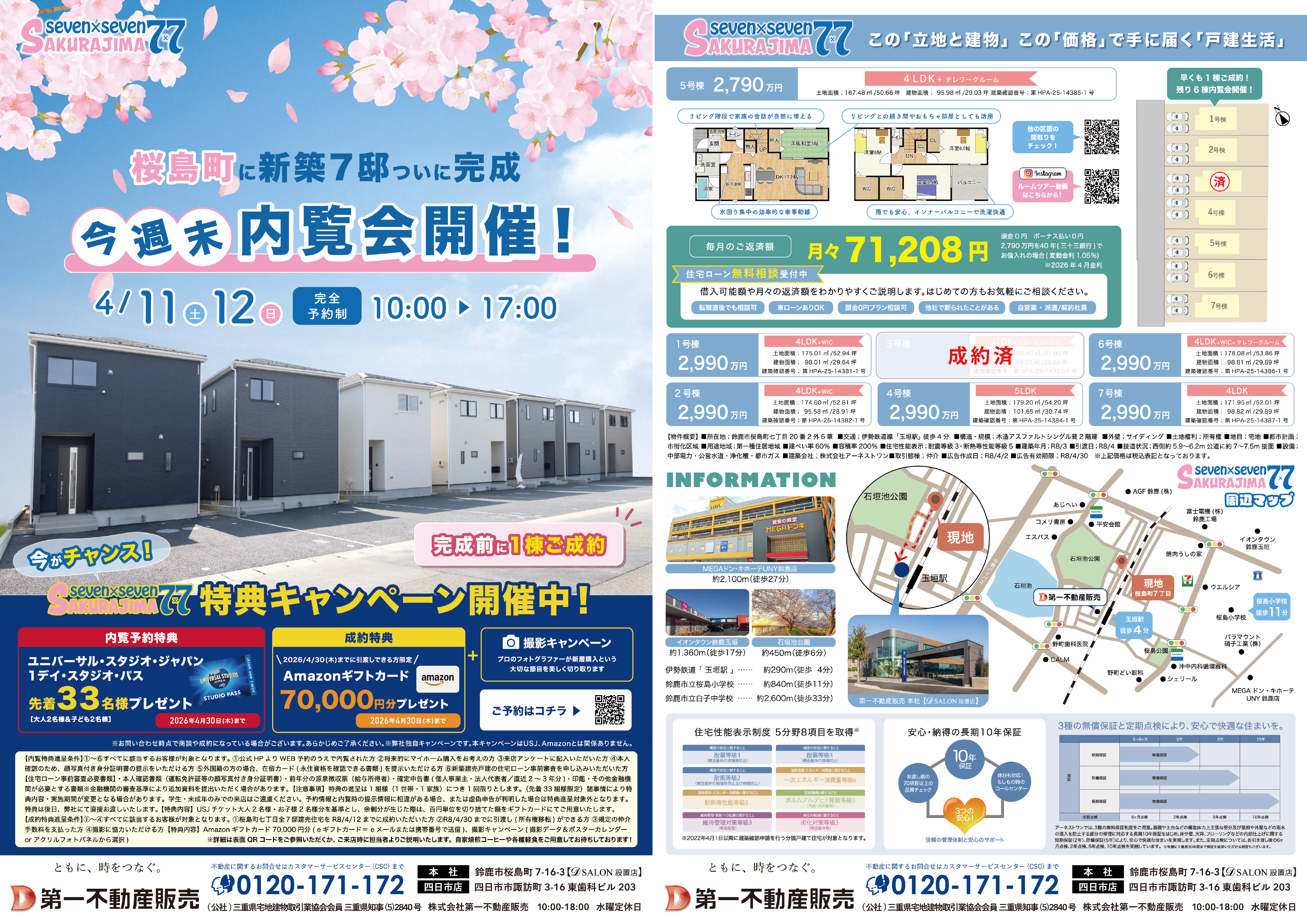 株式会社第一不動産販売では、鈴鹿市桜島町7丁目にてどこよりも早く新築建売住宅の完成内覧会を開催いたします。