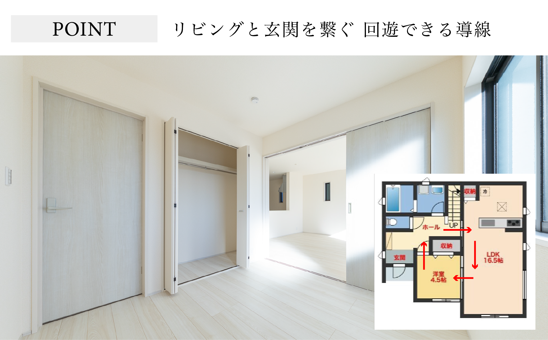 玄関からリビング・洋室・玄関へスムーズにアクセスできる回遊動線です。
