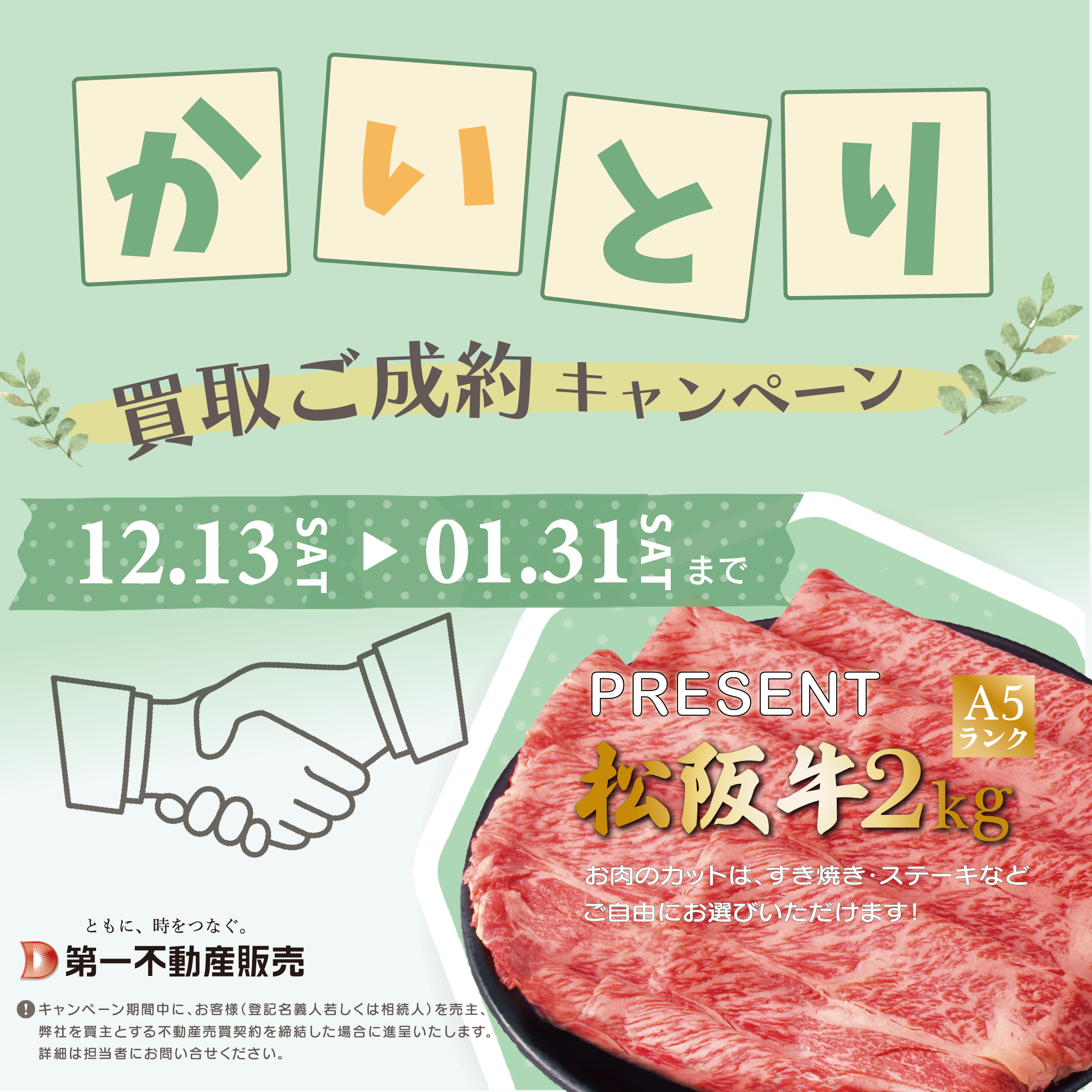 キャンペーン期間中【12/13(土)~1/31(土)】に、お客様(登記名義人若しくは相続人)を売主、弊社を買主とする不動産売買契約を締結した場合に進呈いたします。